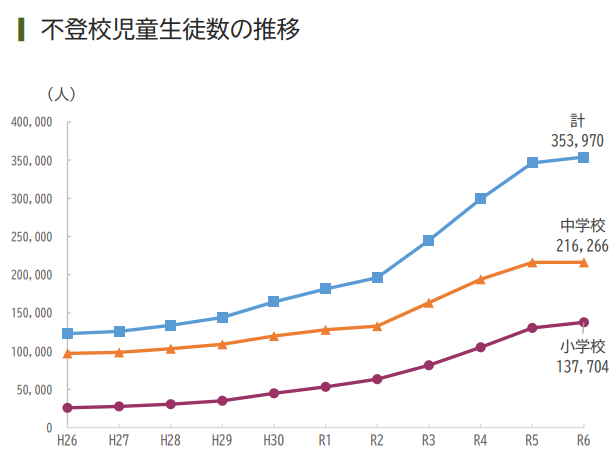 2024年度の不登校児童生徒数は、小学校では13万7704人(前年度比7334人増)、中学校では21万6266人(同154人増)で、小学校と中学校を合計すると35万3970人(同7488人増)となったようです。(引用:令和6年度児童生徒の問題行動・不登校等生徒指導上の諸課題に関する調査より)